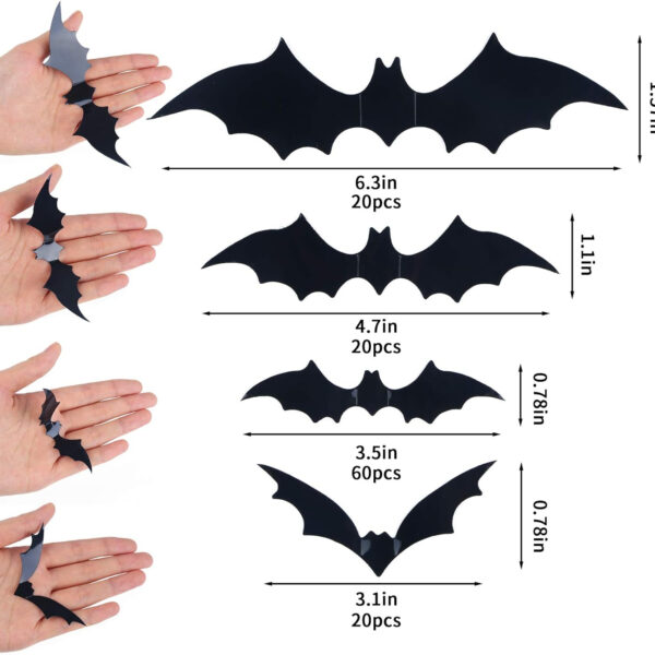 - Package:120 halloween bats stickers in 4 sizes, enough adhesive tape 20 Big (6.3 x 1.5in) bats, 20 Medium (4.7 x 1.12in), 20 Small (3.15 x 1.5in) and 60 smaller (3.55 x 0.78in) 3D Bats;