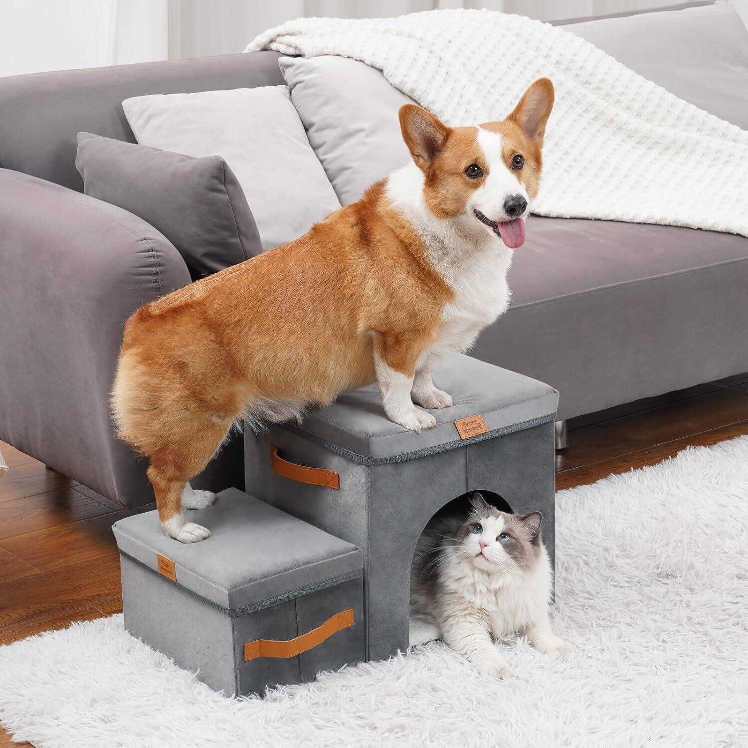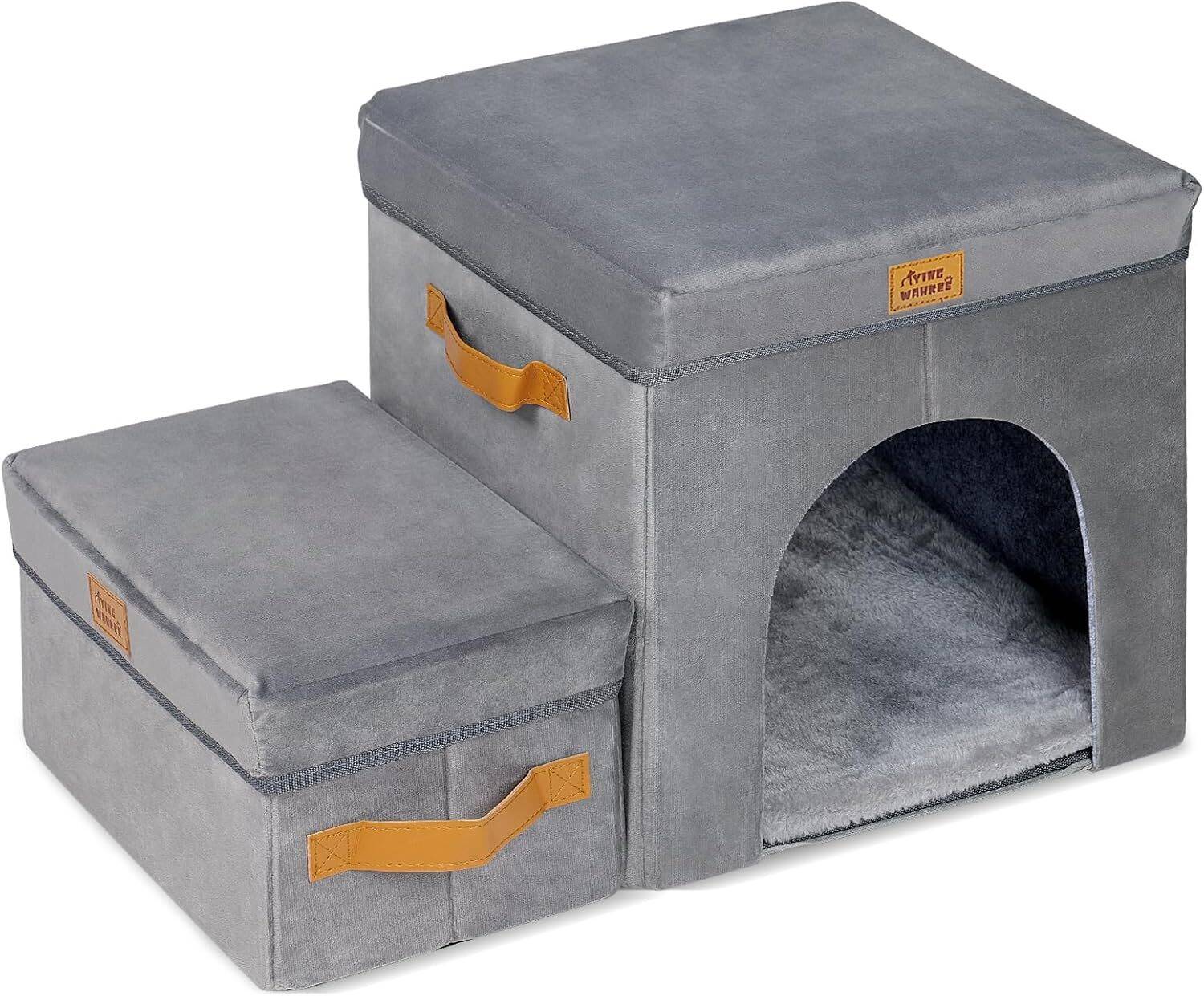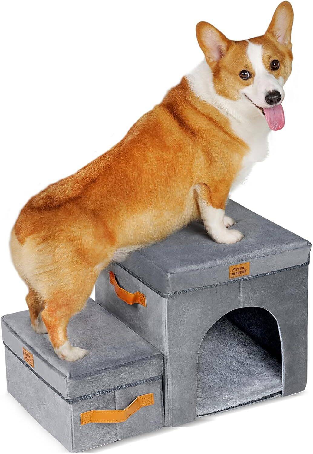 3. Foldable Storage Space: You can store toys, treats, leashes and other pet supplies in the storage box, keeping your home tidy and messy-free. You can also fold and store away the stairs to save space when you don’t use them.