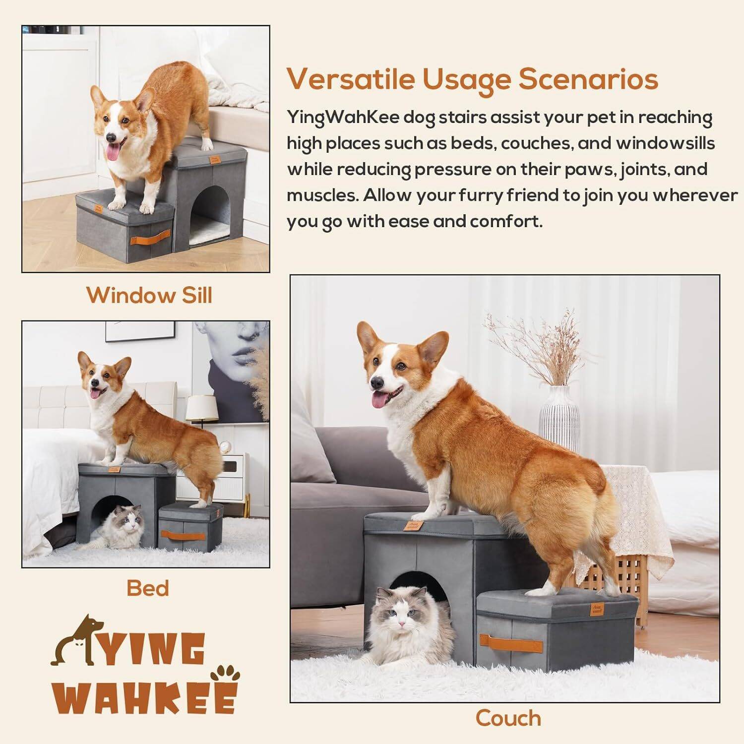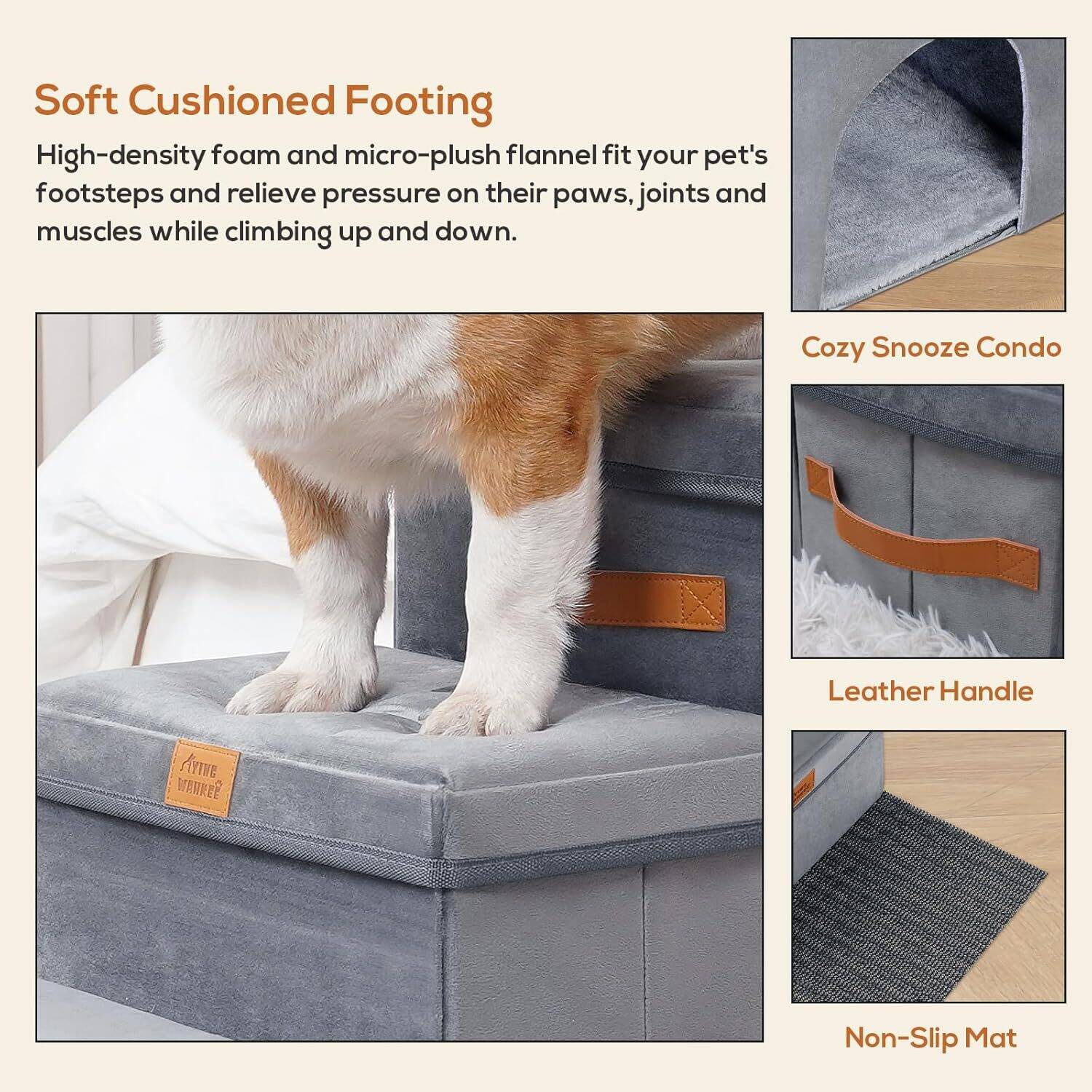 1. Premium Pet Stairs: Sturdy dog stair steps provide a comfort and secure footing for your furry friends as they climb up and down from high places such as beds, couches, window sills and sofas.