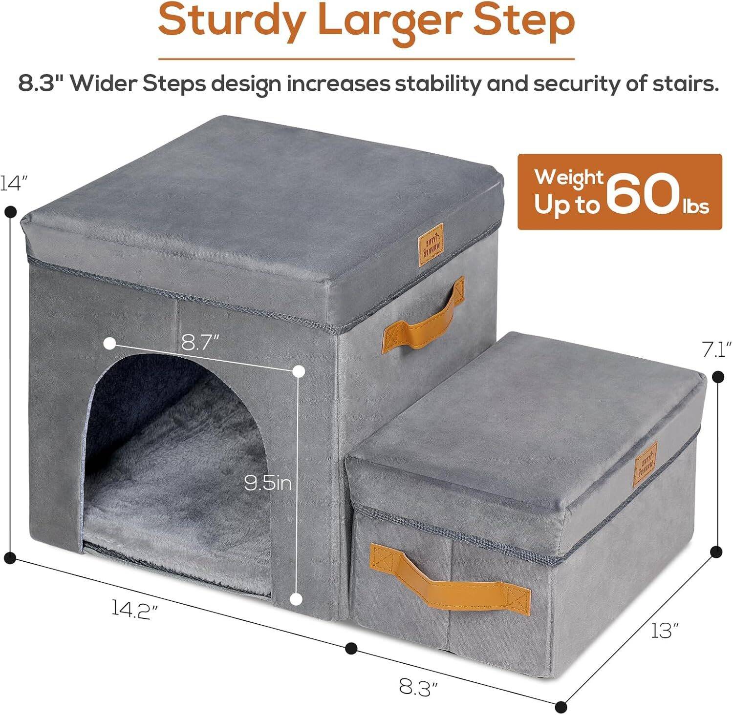 2. Sturdy Larger Step: Non-slip dog stair steps are 8.3″ Wider Sized and filled with soft sponges, fitting your pet’s footsteps and relieving pressure on their paws, joints, and muscles. Weight support up to 60 lbs.