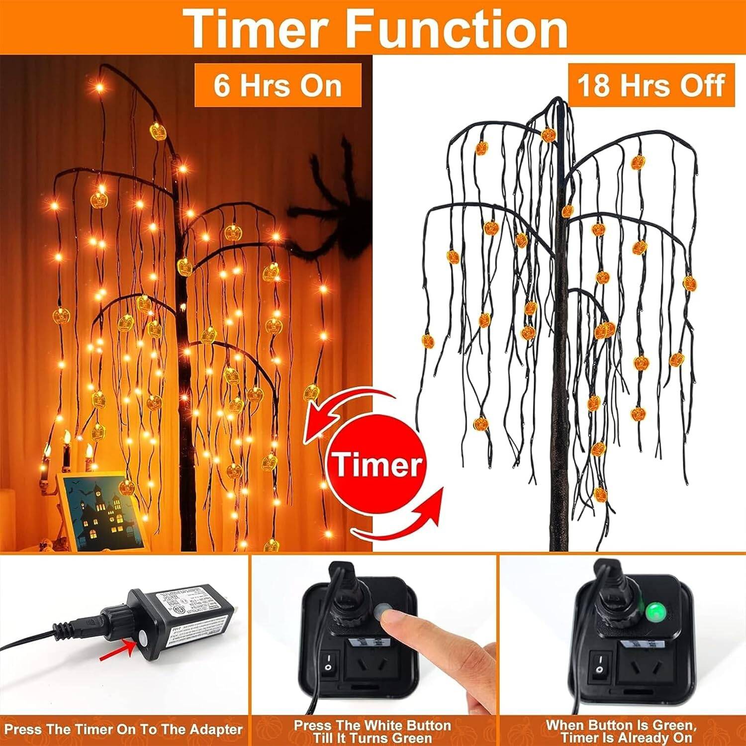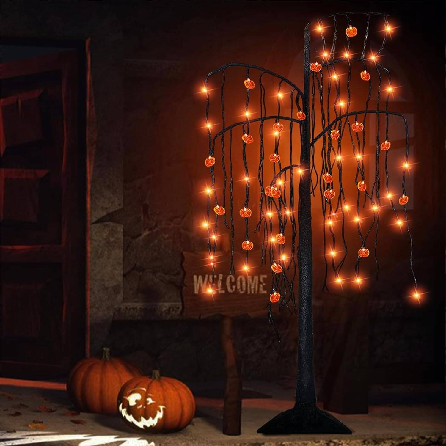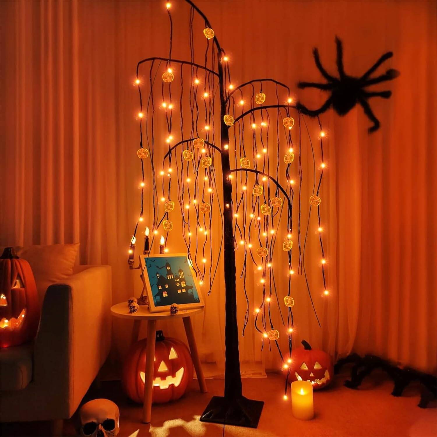 • 5 Feet lighted black Halloween willow tree come with total of 108 Lights(84 LED orange lights and 24 orange Jack O’ Lantern pumpkins).