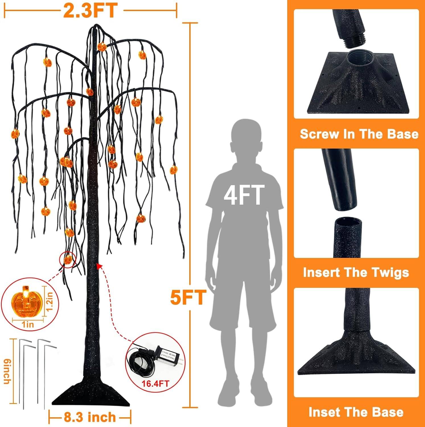 • 5 Feet Halloween Tree with Lights: 5 Feet lighted black Halloween willow tree with pumpkin light come with 3 parts, 2 trunks and 1 base. Needs to be DIY assembled.6 Big Twigs forked with 54 small Twigs. Square stable Base come with 4pcs 6 inch stakes to secure the tree into ground.