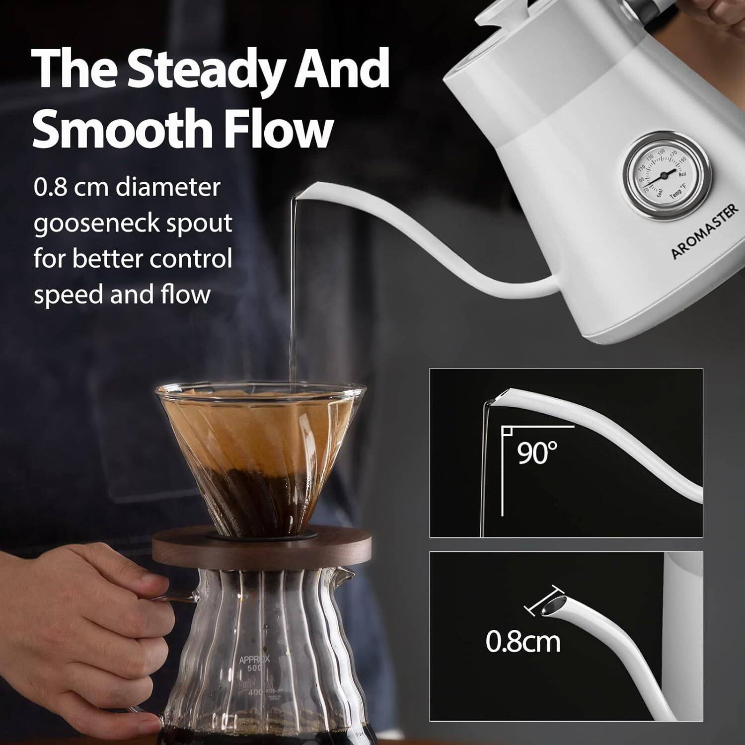 - ?️【Precise Temperature Reading】Colder water will result in under-extract, while water that is too hot will also cause a loss of quality in the taste of the coffee.AROMASTER’s gooseneck kettle is built in thermometer allows you to pour over coffee at the optimal temperature (195-205°F) to extract full flavors and aromas.