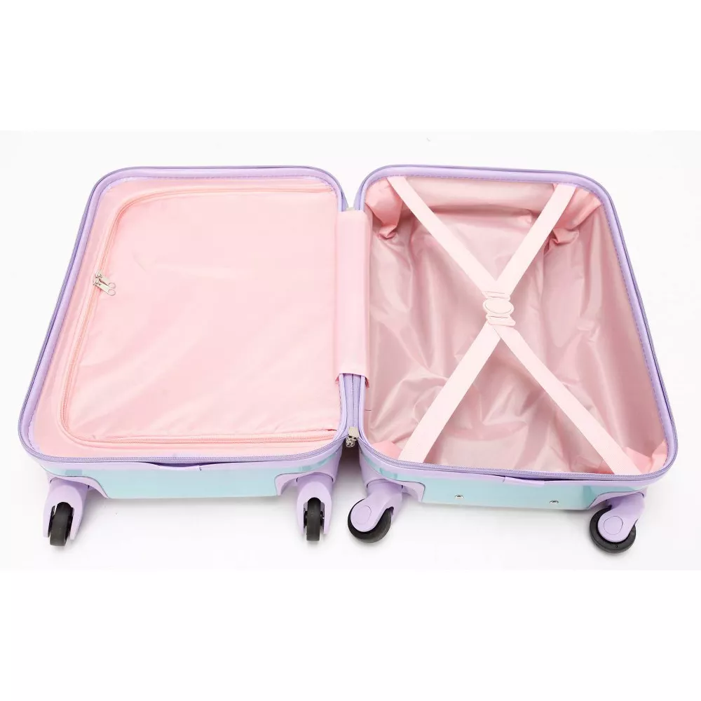 I love how this has two separate compartments inside. One side has the criss cross clip and the other side zips closed for a sort of separation. We have family that lives far so when we visit, it is for days at a time. My daughter is getting old enough to want to bring a whole bunch of her own stuff and we couldn’t share a suitcase anymore. This is great. Has four wheels so she can easily push it herself. I believe it is carry on size as well.
