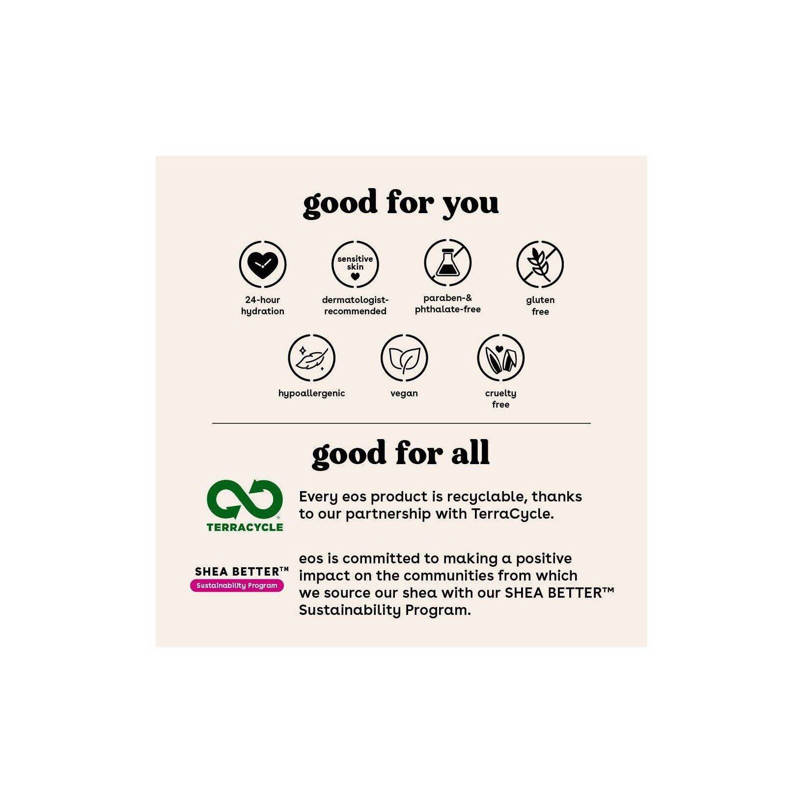 ALL-NATURAL SHEA BUTTER: eos products have wild grown, sustainably-sourced 100% natural shea butter to make skin feel moisturized, protected and soft. We are paraben, phthalate and gluten free. Dermatologist tested. Vegan. Hypoallergenic. PETA certified. No products tested on animals.