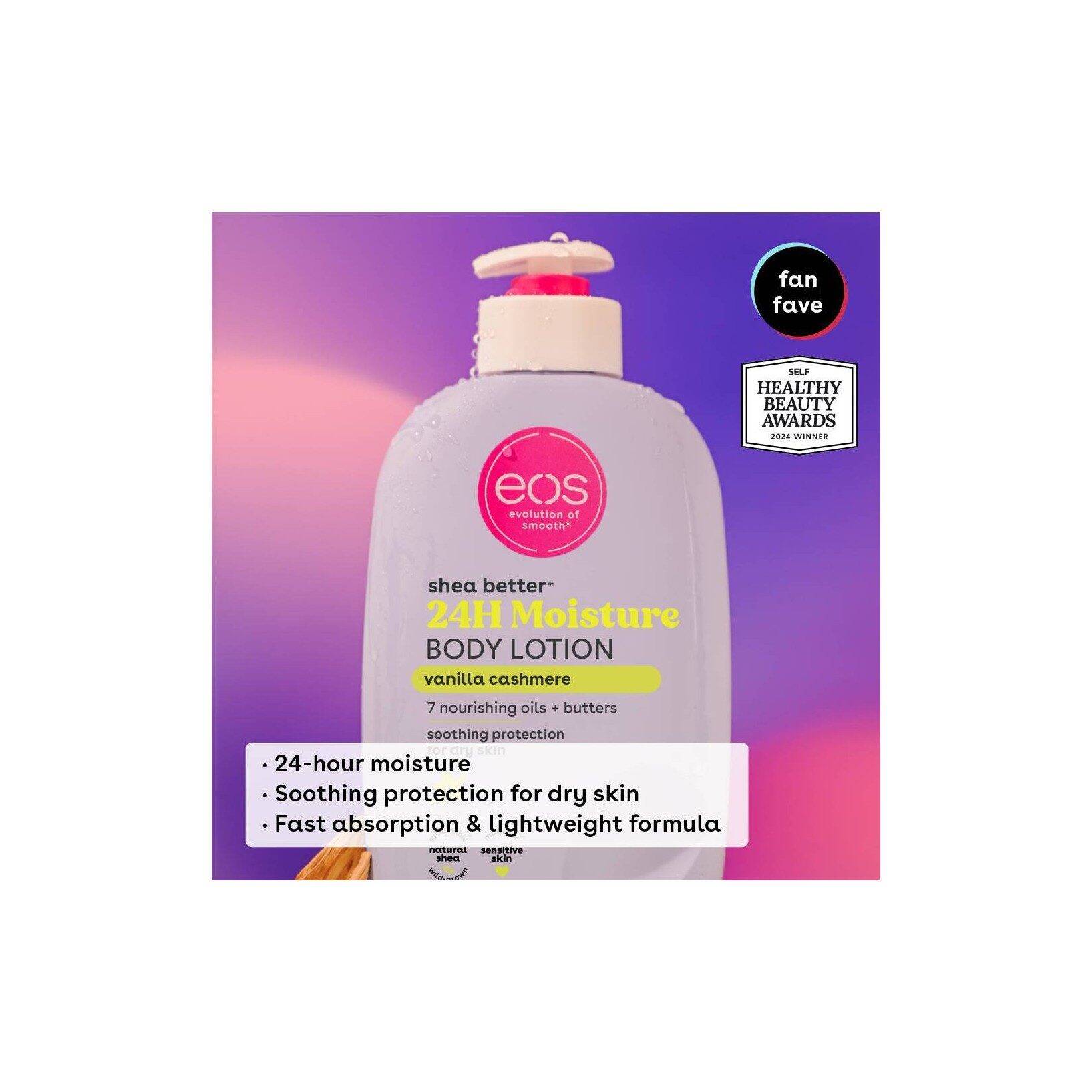 SHEA BETTER BODY LOTION: Our sweet and nuzzly Vanilla Cashmere scent contains fragrance notes of whipped vanilla, soft musk and cozy caramel. eos 24-hour hydration body lotion is made with natural ingredients to leave your skin smooth from head-to-toe.