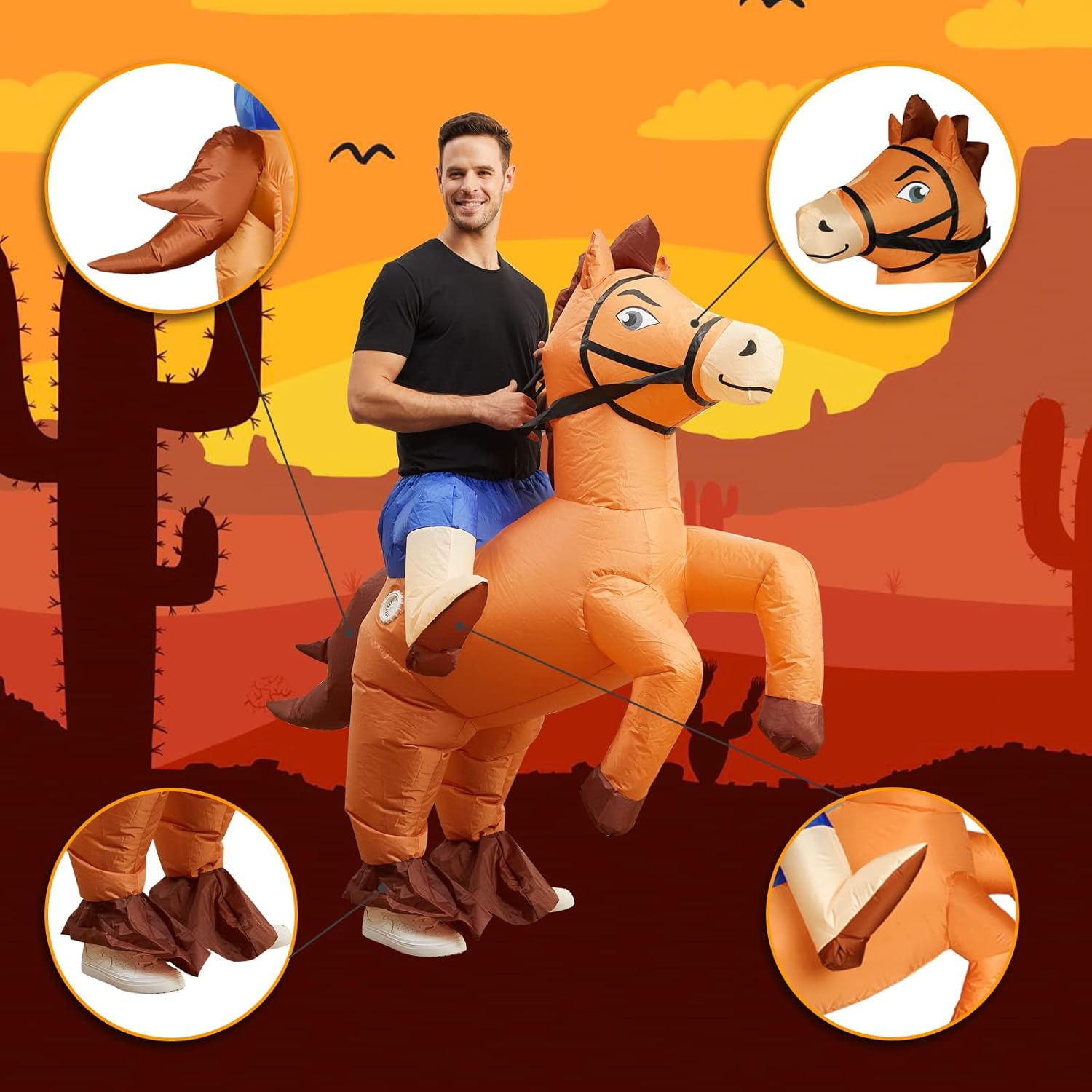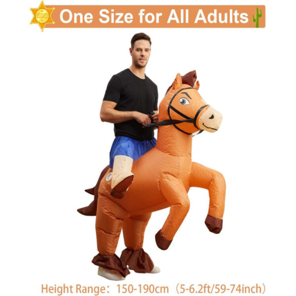 - 【The Perfect Halloween Costume】Horse blow up costume with interesting and amazing display, you can dress up inflatable riding horse costume to take part in Halloween party, the handsome cowboy horse costume will attract everyone’s attention, making you the focus of attention on Halloween and bringing you a perfect Halloween night!