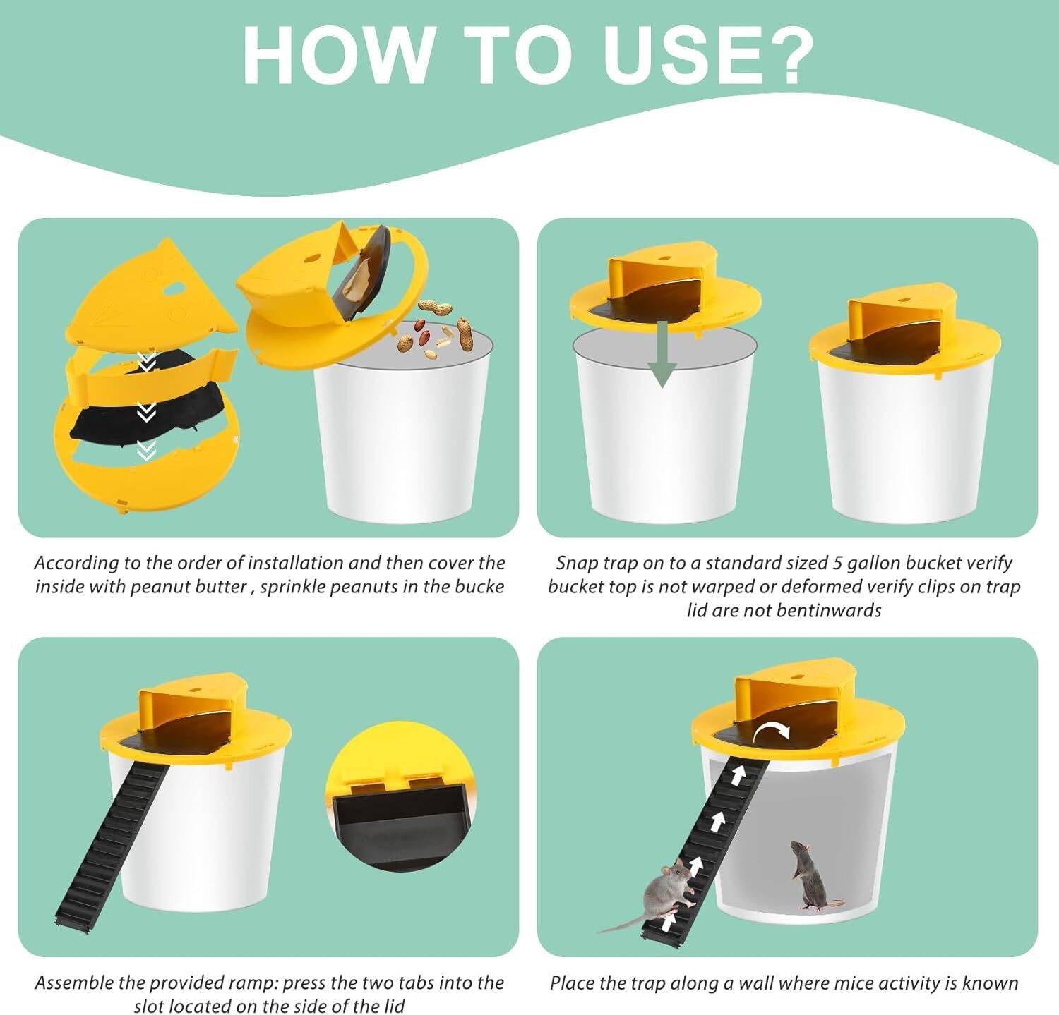- IV. Easy to use and worry-free: Install it on a standard 5-gallon bucket (prepare the bucket by yourself). You can easily catch mice and rats. Putting about 1 gallon of water in the bucket can prevent mice from escaping and increase the success rate. Avoid dealing with dirty mice trapped in traditional traps. You can release or dispose of mice without coming into contact with the mess. All kinds of mousetraps make it easy to control rodent infestations.