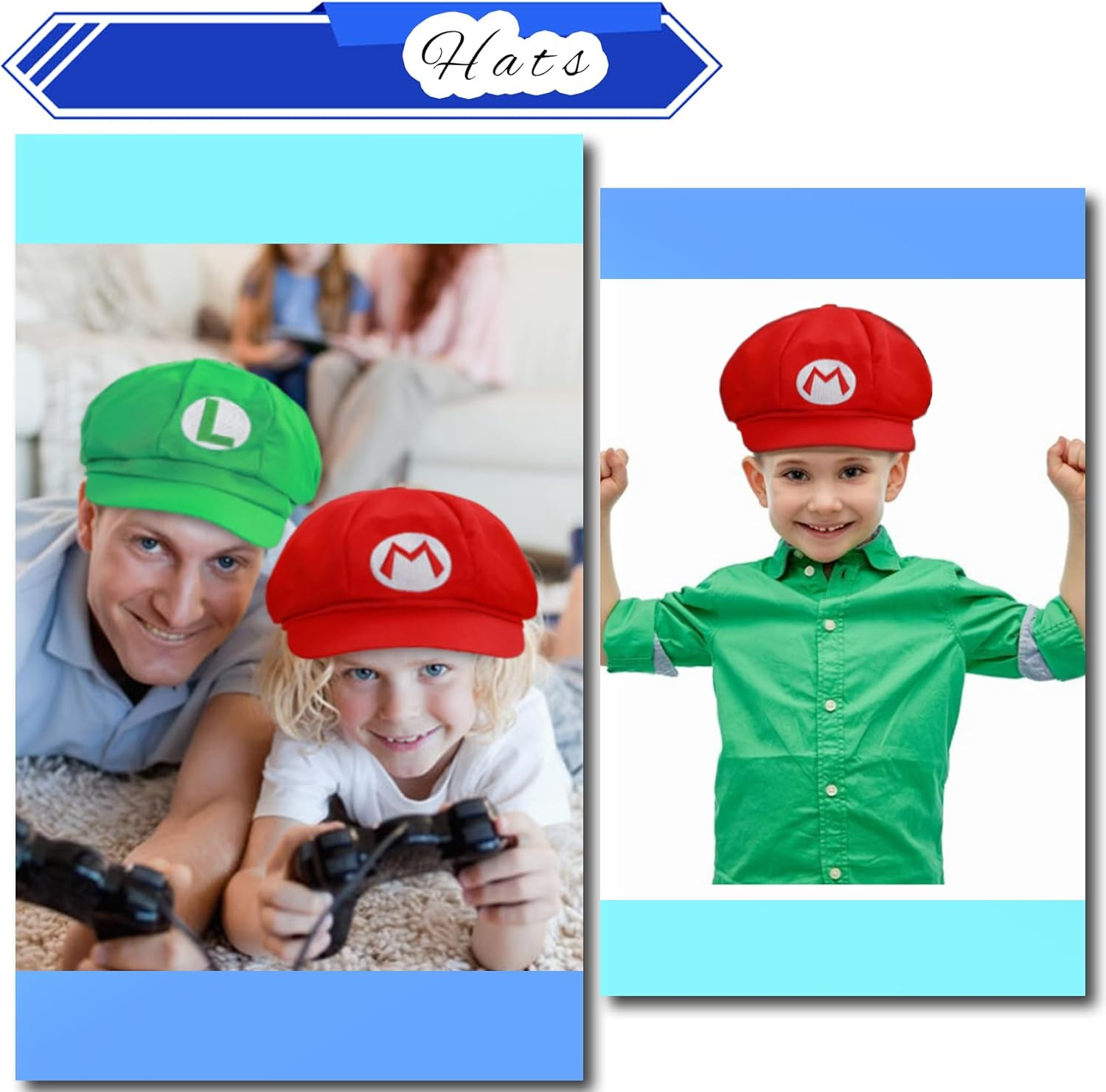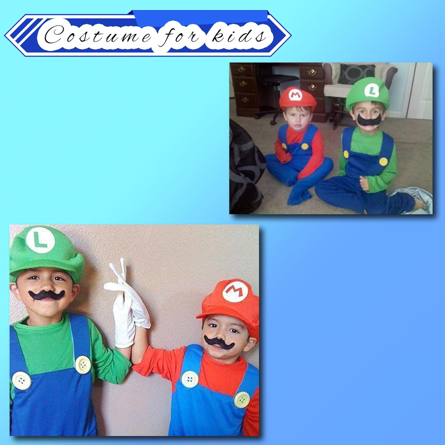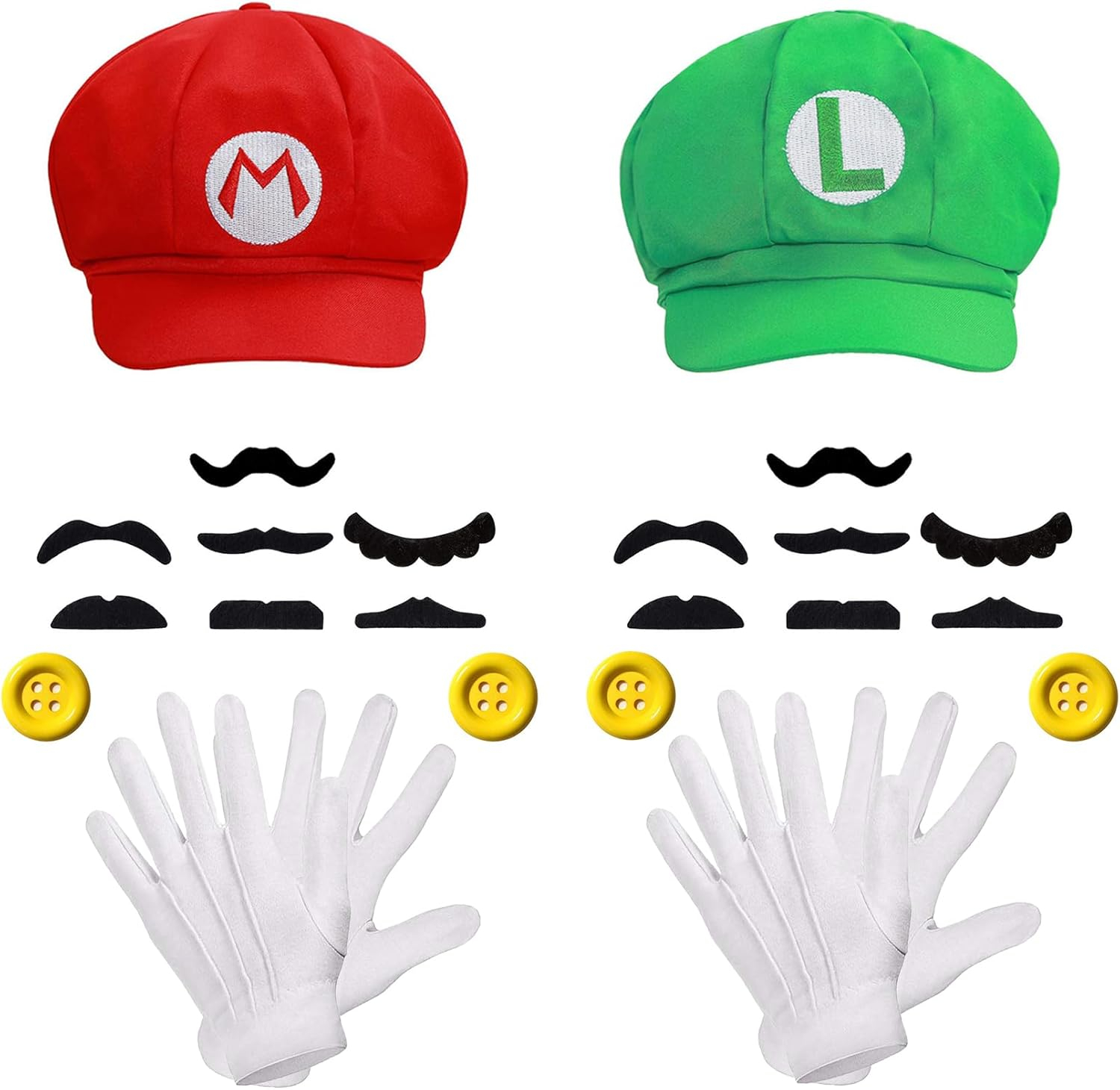 The Mario hat arrived with the top button bent/broken off. I was going to return the set but when I priced white gloves alone and suspenders alone, it was cheaper to keep this set and just purchase other hats.The mustaches are super small, nothing like Mario and Luigi. We ended up just buying waterproof eyeliner/mascara to use.The suspenders are cheapy but they did work for the party.Overall, for the price, it was an okay product but I wouldn’t purchase again.