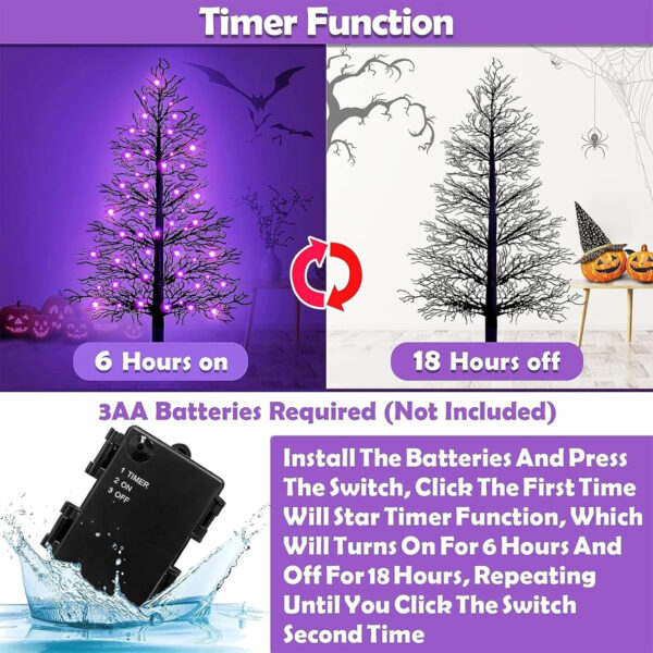 - Timer & Battery Operated: After installing the 3 AA batteries(not included) into the battery box, you can set timer for the Halloween black tree lights to turn on for 6 hours and turn off for 18 hours everyday automatically