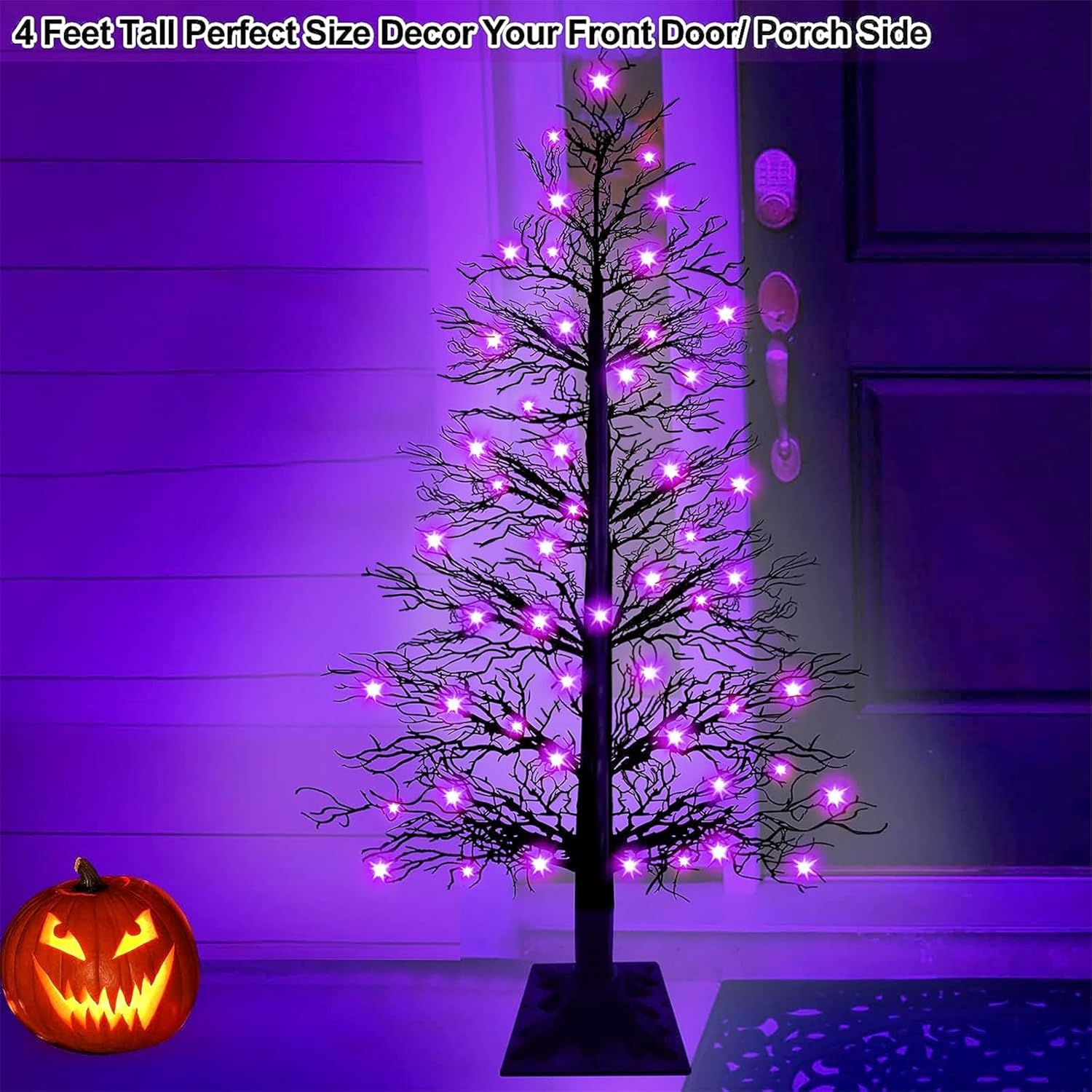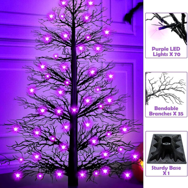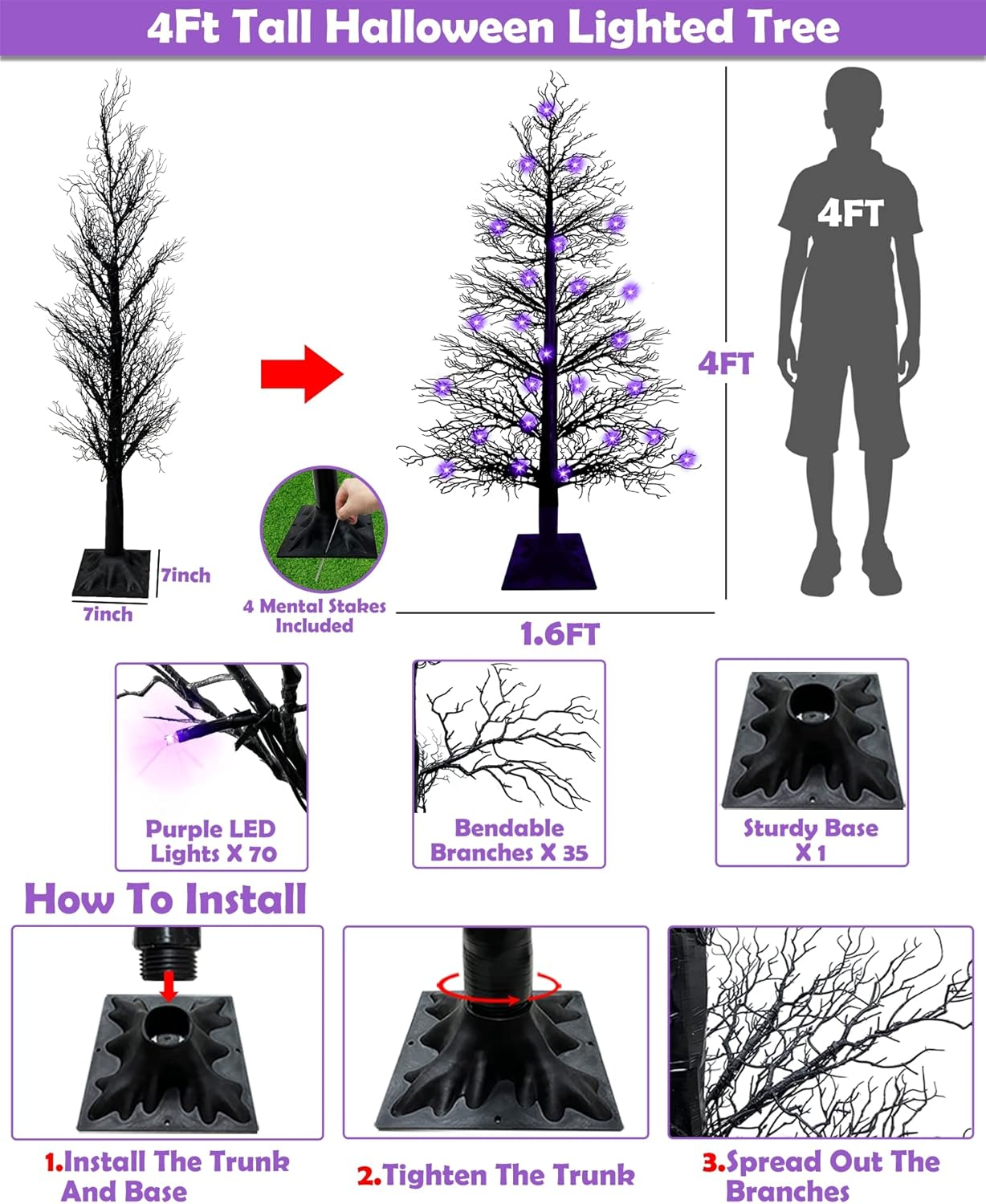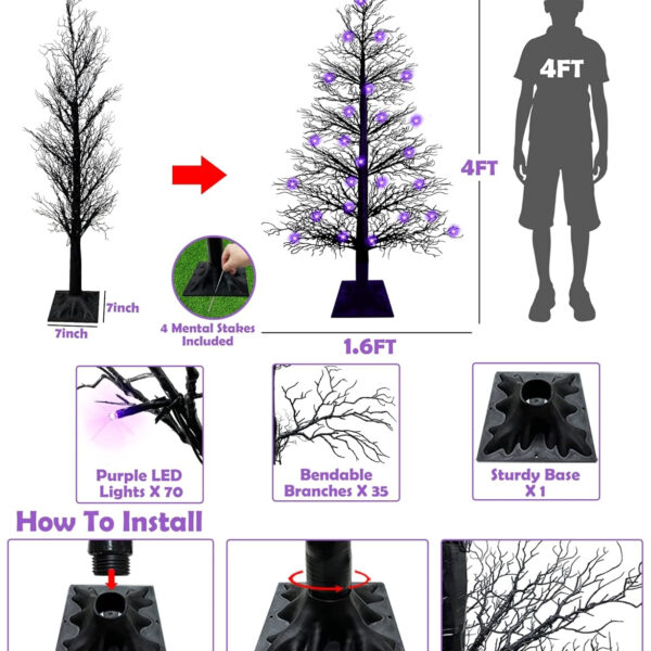 - 4 Ft Black Halloween Tree: The Halloween Black twig tree designed with 70 LED purple lights, 35 branches tips, and a 7 x 7 inch stable base; comes with 4 metal ground stakes for extra stability.