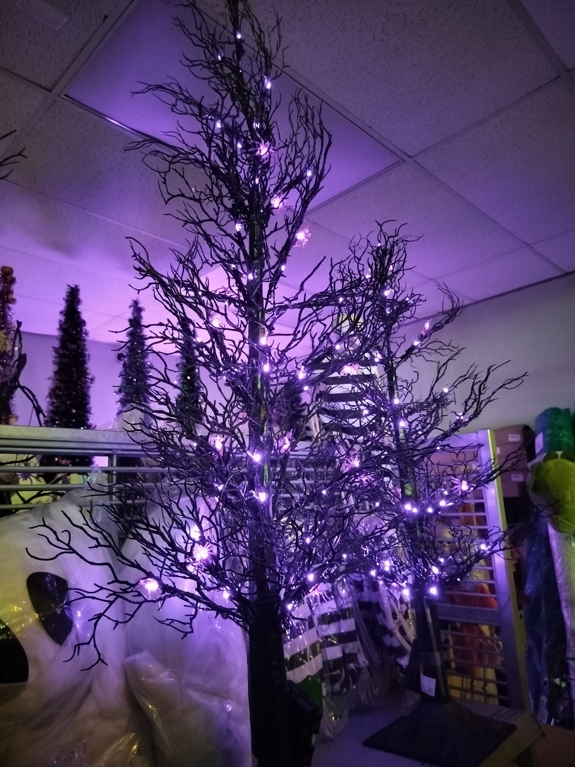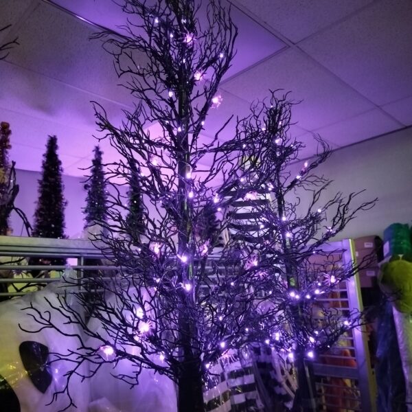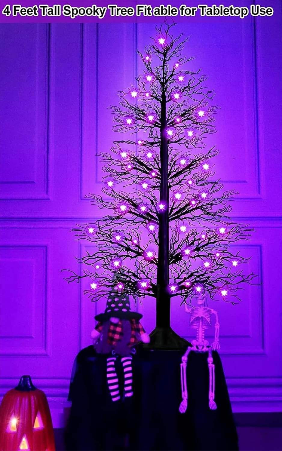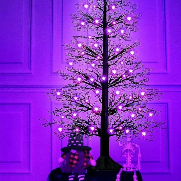 - 4 Ft Black Halloween Tree: The Halloween Black twig tree designed with 70 LED purple lights, 35 branches tips, and a 7 x 7 inch stable base; comes with 4 metal ground stakes for extra stability.