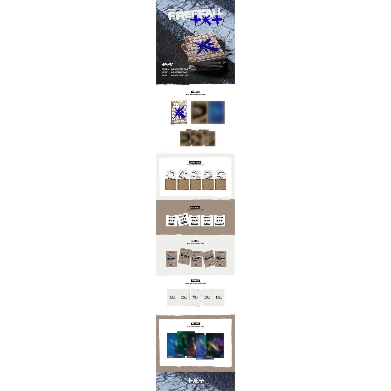 After reaching #1 on the Billboard 200 & finishing their second world tour 2023 ACT:SWEET MIRAGE, TOMORROW X TOGETHER are onto the next with their newest album titled The Name Chapter: FREEFALL. Now available in a compact GRAVITY version, specific to each member: SOOBIN, YEONJUN, BEOMGYU, TAEHYUN and HUENINGKAI. Contents of the album include a CD, Photo Book (rndm 1 of 5), Sticker Pack, Post Card (rndm 1 of 5), Photo Card (rndm 1 of 5) & Mini Poster (rndm 1 of 5). Dimensions: 145 x 205 x 10 mm.