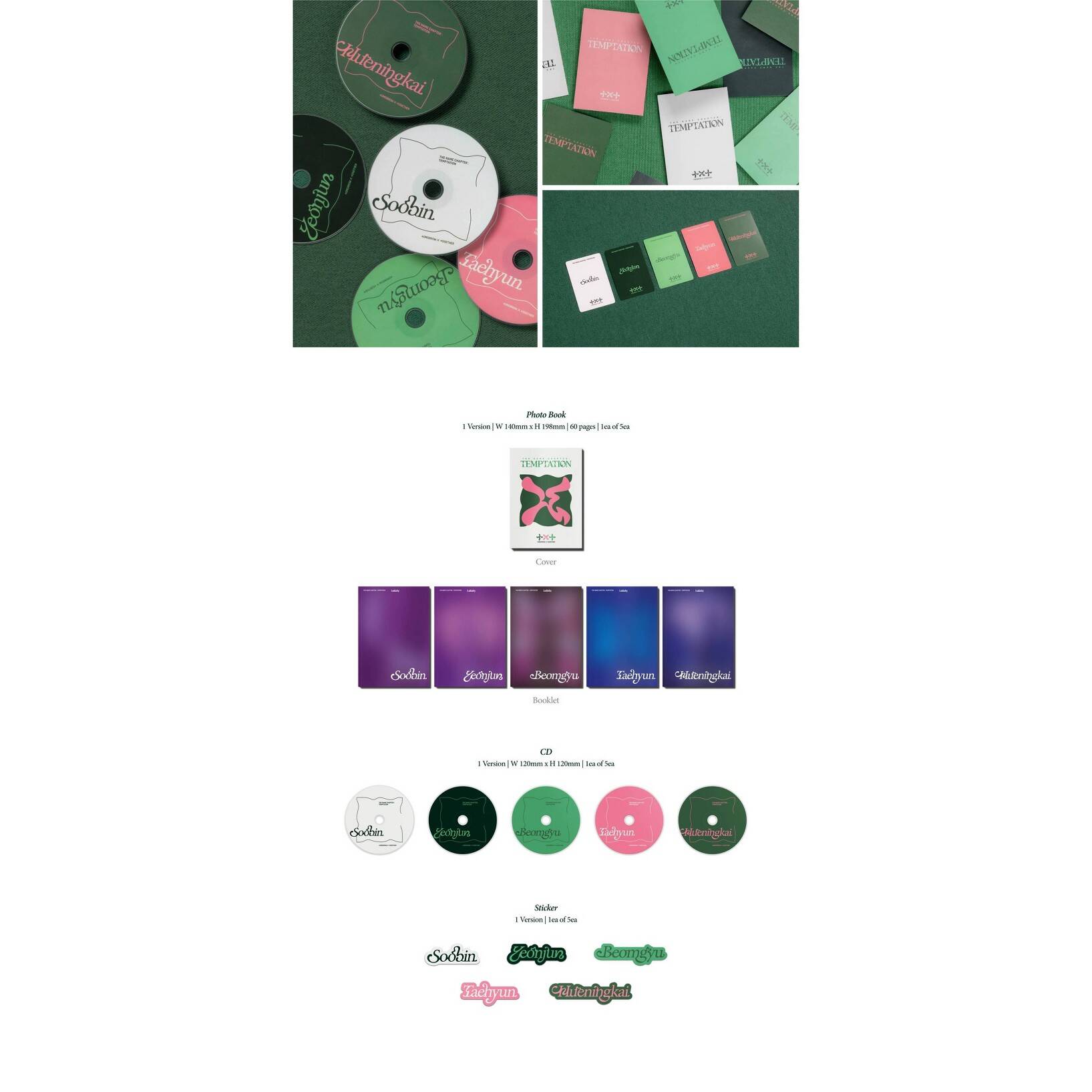 Starting from The Dream Chapter and then The Chaos Chapter, TOMORROW X TOGETHER (TXT) is opening the next with a Lullaby Version of their brand-new EP titled The Name Chapter: TEMPTATION. This Lullaby Compact Version will be available in five different designs. Contents of the album include items specific to each member: a CD, Cover, Photo Book (60 pages; random 1 of 5), Photo Card (random 1 of 5), Sticker, Post Card (random 1 of 5) and Folded Mini Poster. Dimensions: 142 x 199 x 10 mm.