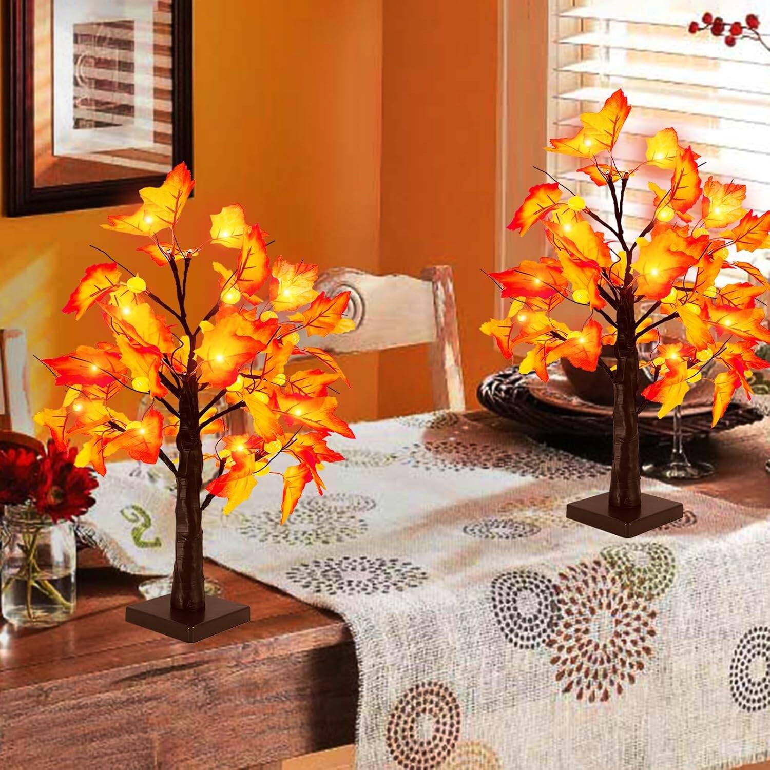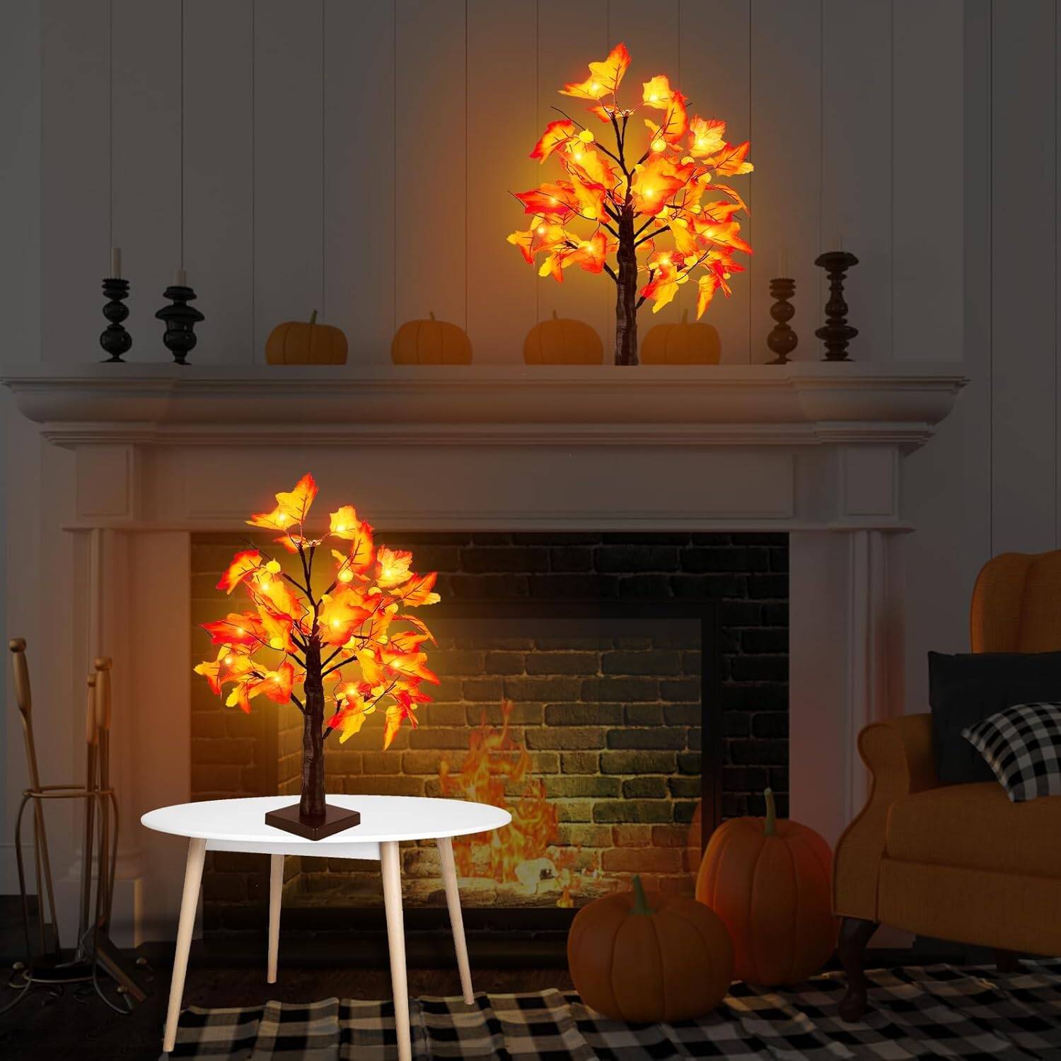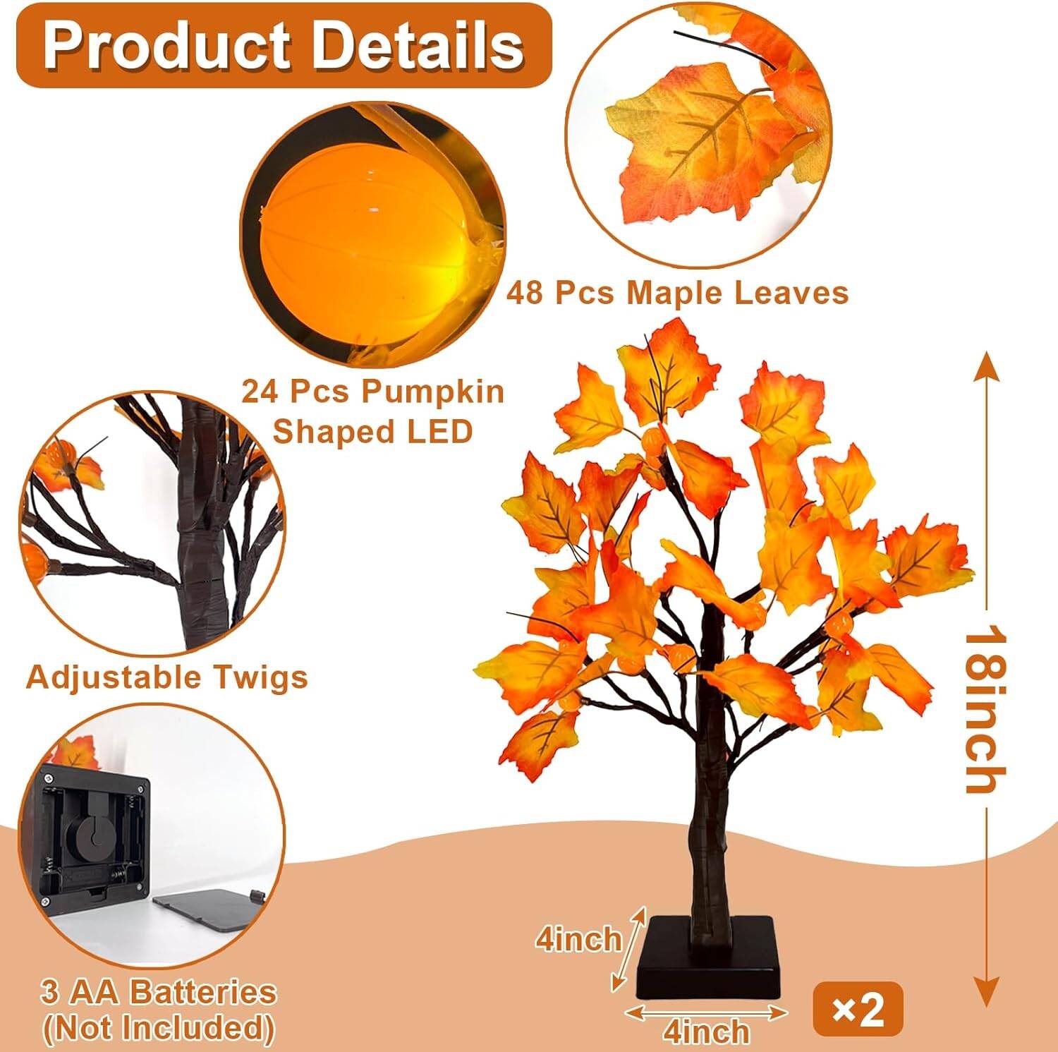 - [ Lighted Fall Tree Tabletop Decor ] 18 Inch Maple Fall Tree Table Decorations with 48 realistic orange-red colors gradient maple leaves(2 sizes) and 24 pumpkin shaped LED. Warm white lights will add a warm atmosphere for your fall home decorations.