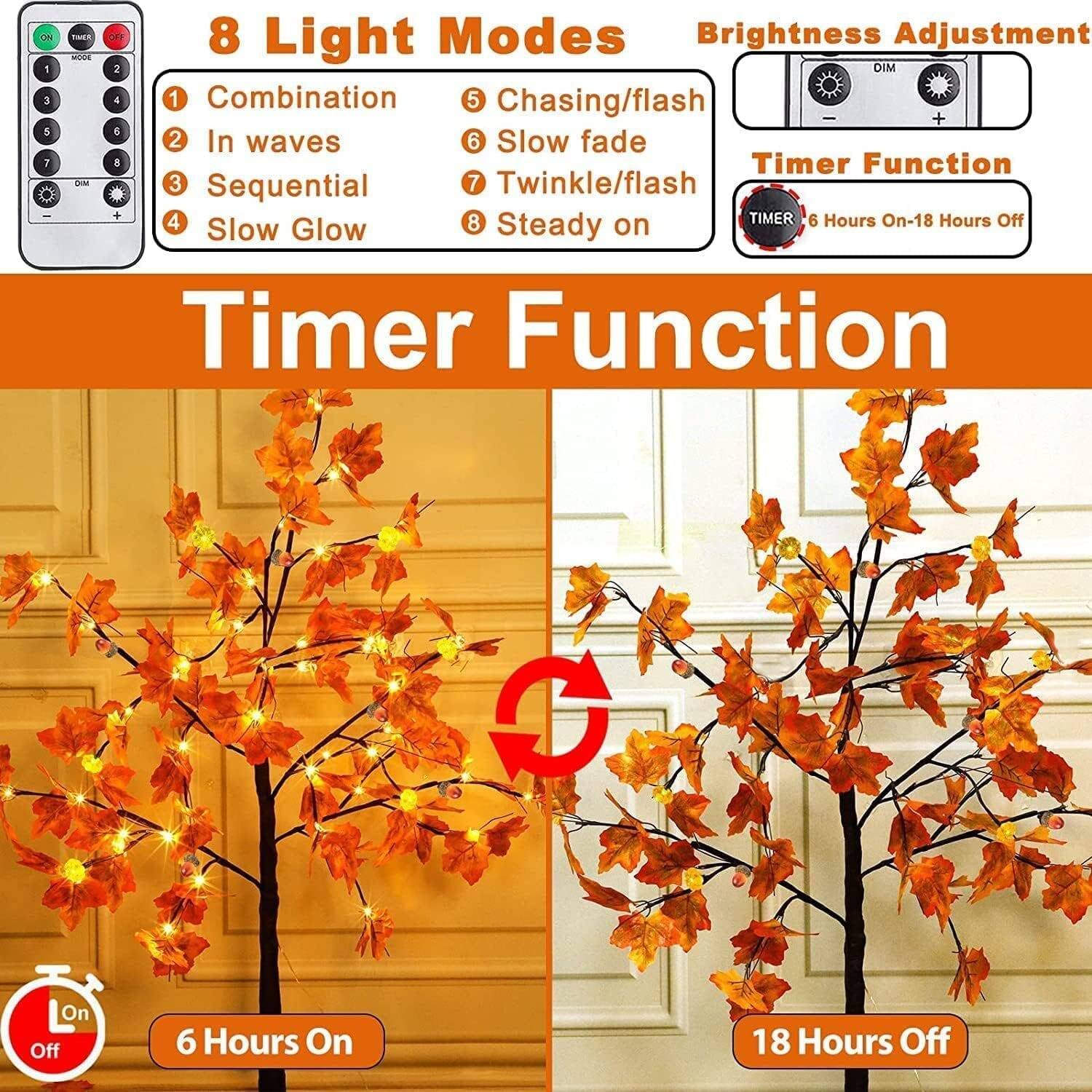 - Timer & DIM Functions: Come with a 8 key remoter, and active the timer function for 6 hours on and 18th hours off each day. Simply turn on the Fall tree lights, select the mode, and set it in timer