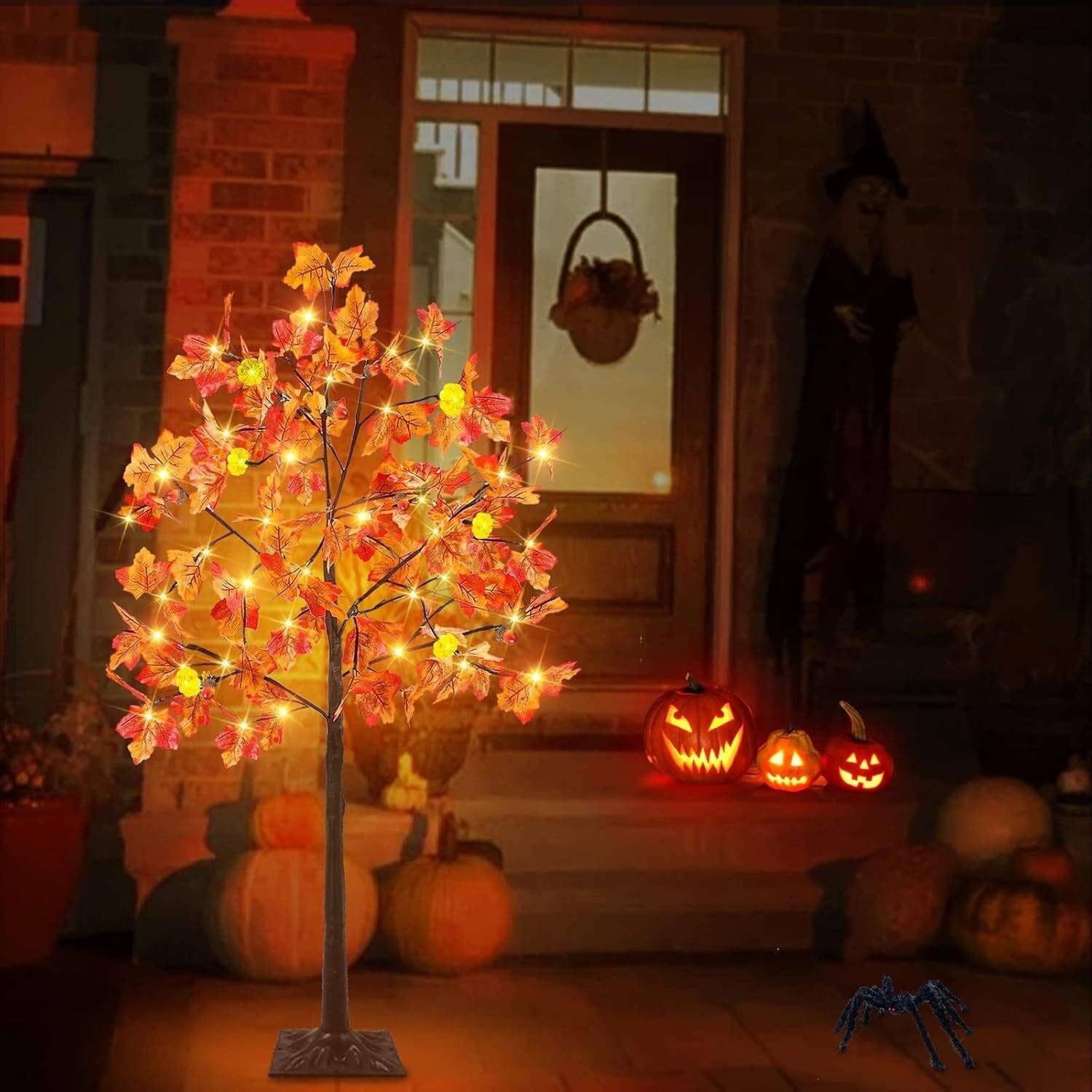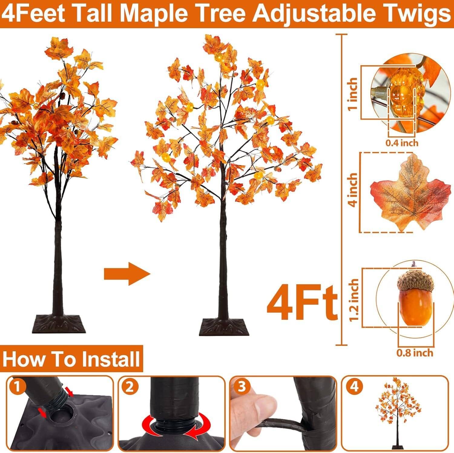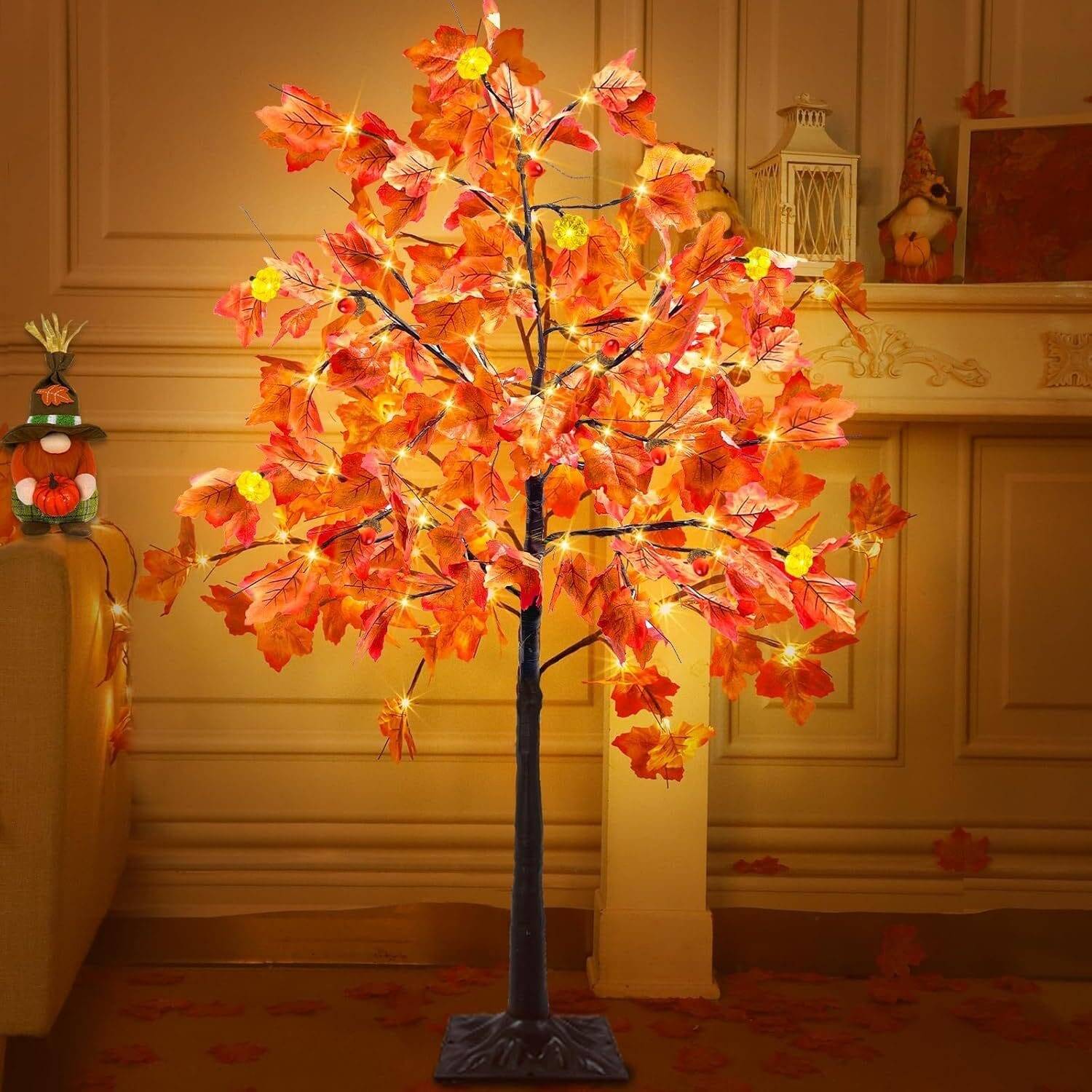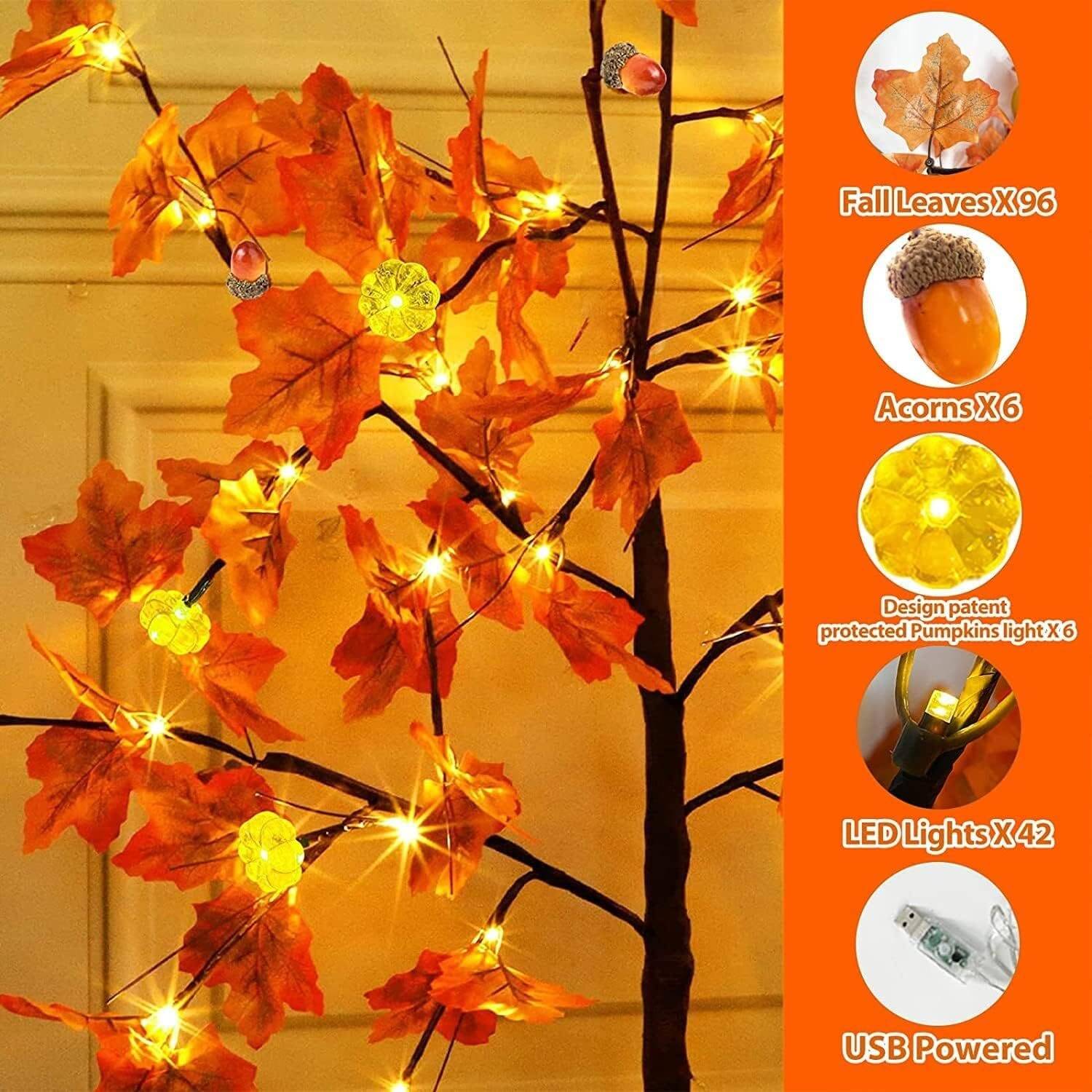 - Patented 4 Ft Prelit Maple Tree with Unique 3D Pumpkins: Exclusive Realistic Feel Maple Tree. 6 Pumpkin lights, 48 LEDs, 6 Acorns, 96 maples leafed 24 branches, brown trunk. Plug in to use. 3D pumpkin lights. 4.5V low voltage